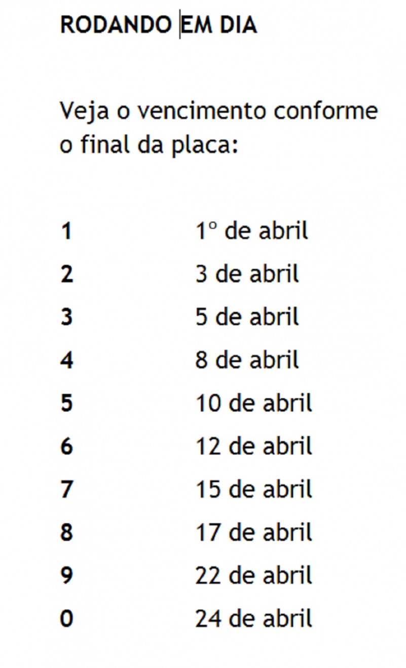A quarta-feira (3) é a data-limite para placas com o final 2, por exemplo. O vencimento dos números seguintes ocorre sempre a cada dois dias úteis ao longo do mês de abril. Dessa maneira, a sexta-feira (5) é a última oportunidade para a numeração que termina em 3. (Veja tabela com cronograma.)